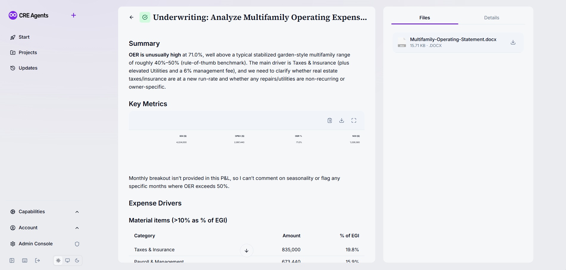The Real Estate Analyst AI Coworker reads the financials, calculates the operating expense ratio, benchmarks it, and breaks every expense line into two buckets: material drivers (anything above 10% of EGI) and everything else. For the material items, it explains why each one matters for underwriting. It flags months where OER exceeds 50%, notes assumptions where details are missing, and delivers the whole thing in a structured format you can hand to your team or drop into a memo.