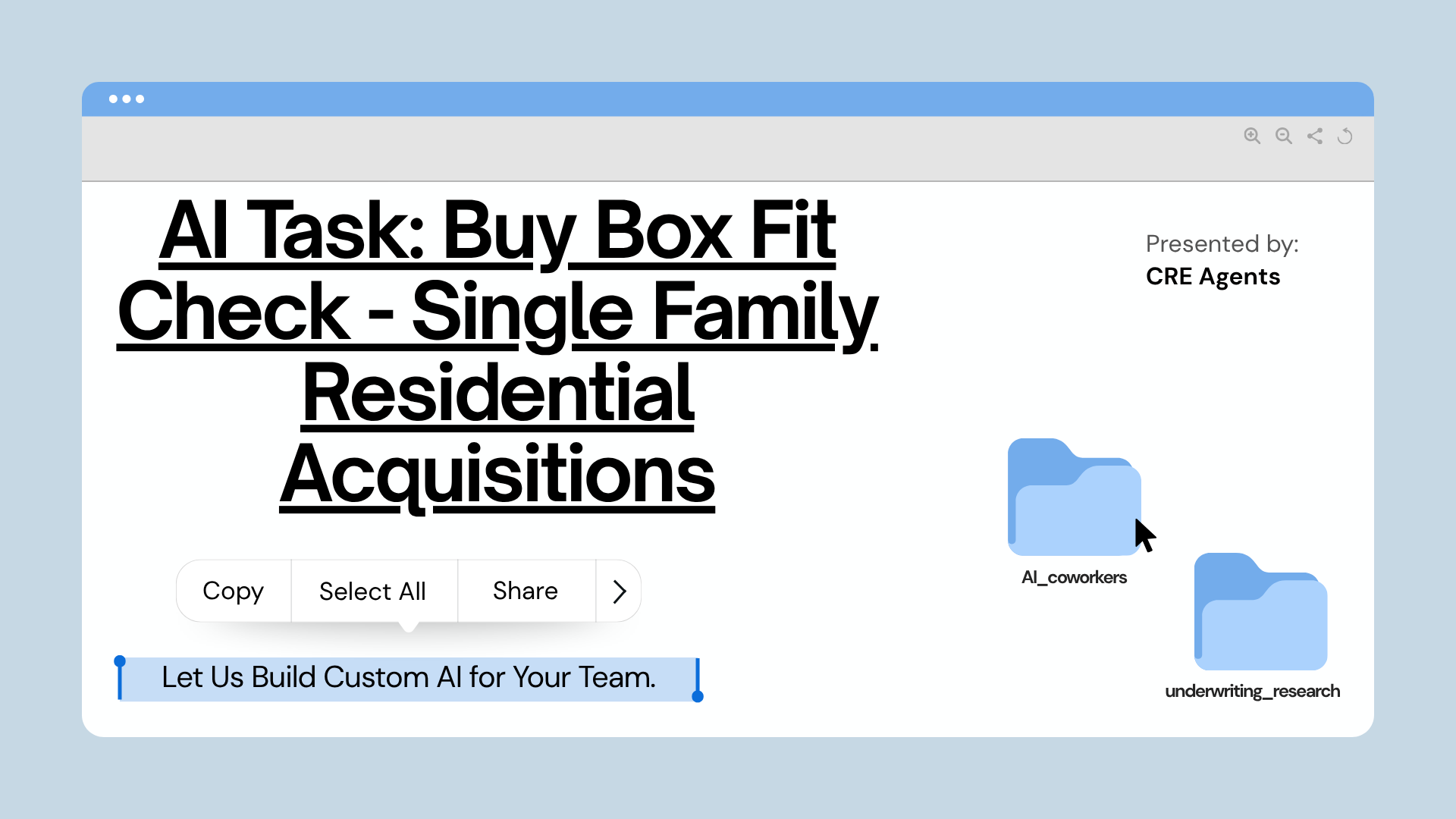 That’s exactly what it’s built for. Each screening takes roughly 10 minutes, so you can process five or six deals in an hour. Your buy box criteria stay consistent across every run because you define them once and reuse them. For investors or teams screening 10 to 20 deals a week, this turns a full-day exercise into a morning task. The AI coworker uses memory, so it can learn your preferences over time and apply them to future screenings.