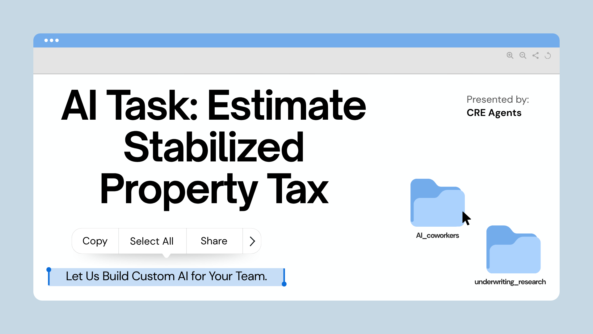 Property tax is one of the largest operating expenses in any CRE underwriting model, but the stabilized estimate often gets the least amount of rigorous analysis. This task closes that gap.