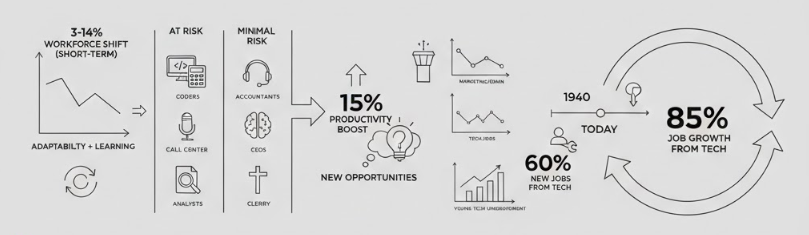 Perhaps most reassuring is the historical context: approximately 60% of today’s US workers are employed in occupations that didn’t exist in 1940. This suggests that more than 85% of employment growth over the past eight decades has come from technology-driven job creation. The pattern of technological disruption followed by new opportunity formation has proven remarkably consistent throughout modern economic history.