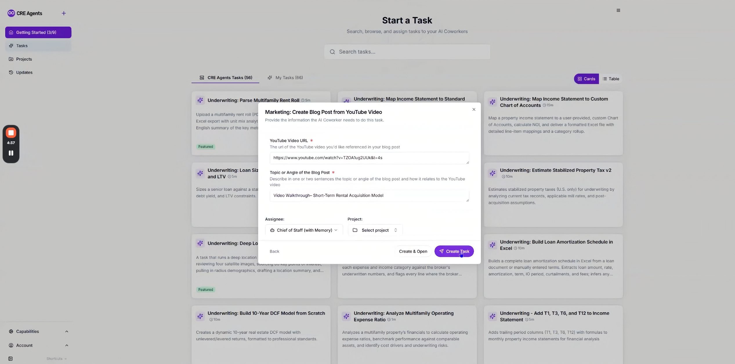 From there, the Chief of Staff AI coworker pulls the video transcript, extracts the key ideas, and generates a complete, SEO-structured blog post — with a title, organized sections, logical flow, and a clear conclusion. The output lands directly inside your CRE Agents workspace, ready to review, copy, and publish.